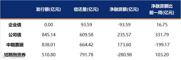 非金融企业短融、中票、企业债、公司债发行量、偿还量、净融资额(与前一周比较)
