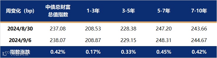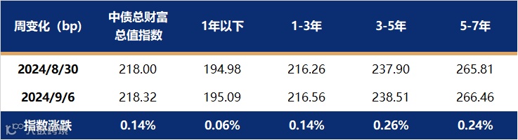 上周利率债各期限收益率均下行,中短端下行幅度大于长端,曲线继续趋陡。主要原因是央行公开市场买卖国债操作落地,并且采取了买入短端国债并且卖出长端国债的操作方式,且市场对于9月降准的预期较高,因而短端国债更受到市场青睐,买盘力量较强,期限利差扩大。截止至9月6日,1年期国债收益率报在1.4352%,较8月30日下行5.48bp;10年国债收益率报在2.1388%,较8月30日下行3.16bp。中债总财富指数单周大涨0.42%,其中5-7年、7-10年指数涨幅更大,1-3年指数微涨。