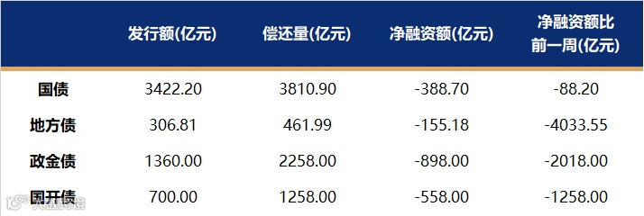 国债、国开、政金债、地方债发行量、偿还量、净融资额(与前一周比较)。