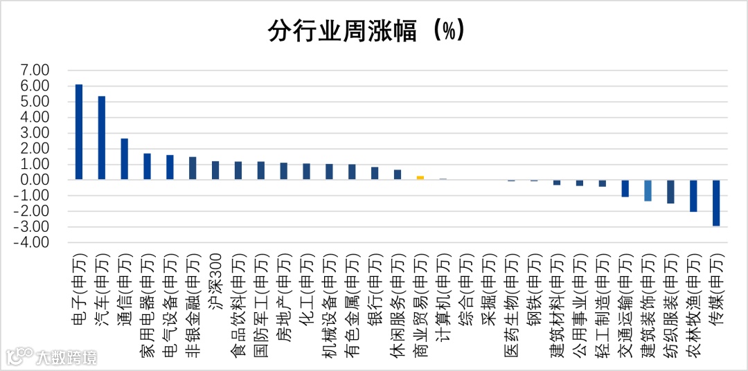 进入7月第二个交易周,市场整体较前一周上涨。两市成交金额周均上涨至6,941.66亿元,北向资金周净流入131.73亿元,两融余额14,649.07亿元。截至上周五收盘,上证综指周涨0.72%,收于2,971.30点,深证成指周涨1.82%,收于8,854.08点,沪深300周涨1.20%,收于3,472.40点,创业板指周涨1.69%,收于1,683.63点。各行业(申万一级行业,下同)来看,电子、汽车、通信涨幅居前,分别为6.12%、5.37%、2.66%;传媒、农林牧渔、纺织服装跌幅居前,分别为-2.94%、-2.02%、-1.50%。