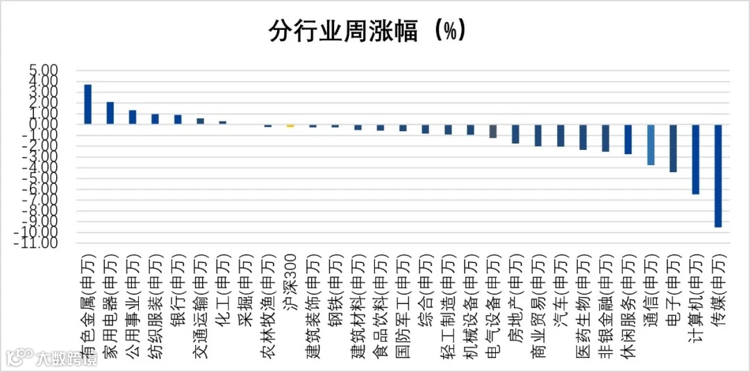 进入3月第五个交易周,市场整体较前一周下跌。两市成交金额周均下跌至9,408.58亿元,北向资金周净流入53.81亿元,两融余额15,379.49亿元。截至上周五收盘,上证综指周跌0.23%,收于3,041.17点,深证成指周跌1.72%,收于9,400.85点,沪深300周跌0.21%,收于3,537.48点,创业板指周跌2.73%,收于1,818.20点。各行业来看,有色金属、家用电器、公用事业涨幅居前,分别为3.72%、2.10%、1.34%;传媒、计算机、电子跌幅居前,分别为-9.52%、-6.47%、-4.43%。