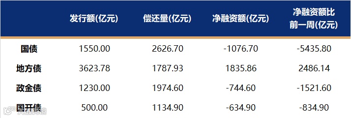 国债、国开、政金债、地方债发行量、偿还量、净融资额(与前一周比较)。