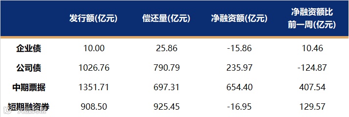 非金融企业短融、中票、企业债、公司债发行量、偿还量、净融资额(与前一周比较)