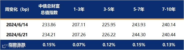 上周利率债多数期限收益率有所下行,仅10年品种表现较弱。利率债市场走强的原因主要是一方面上周央行加大了逆回购投放力度,呵护税期资金面;另一方面陆家嘴金融论坛,央行行长重申货币政策立场,淡化中长期政策利率和货币数量目标的关注,再提示非银大量持有中长期债券的波动风险,没有更多超预期内容,或一定程度缓解债券市场担忧。截止至6月21日,1年期国债收益率报在1.5915%,较6月14日下行0.25bp;10年国债收益率报在2.2571%,较6月14日上行0.13bp。中债总财富指数微涨0.5%,各期限指数涨幅较为均衡。