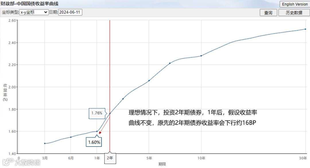 在这里,国小金为大家展示下2024年6月11日中国国债的收益率曲线。假设投资者在2024年6月11日买入2年期债券,到期收益率为1.76%,持有1年后,在2025年6月11日,该债券的剩余期限缩短为1年,假如收益率曲线不发生任何变化,那么该债券的到期收益率会自然下滑约16BP至1.60%左右,这16BP即为骑乘策略的资本利得。