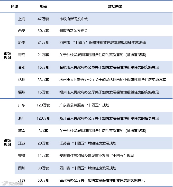 上述政策以及与之配套的各地“十四五”期间相关规划,对各地租赁住房供应规模进行了明确,在比例上多地规定保障性租赁住房占新增住房供应套数的比例至少达到15%以上。据不完全统计,部分省市的保障性租赁住房在“十四五”期间的规划规模如下。
