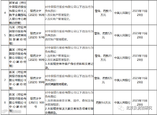 有6人被罚款5万元及以上,分别为时任中国银行股份有限公司信息科技部副总经理马某,时任中国银行股份有限公司银行卡中心副总经理张某,时任中国银行股份有限公司银行卡中心副总经理陈某,时任中国银行股份有限公司银行卡中心高级风险经理(风险管理)、银行卡中心风险管理与智能决策团队高级风险经理王某超,时任中国银行股份有限公司内控与法律合规部资深内控合规经理郑某苹,时任中国银行股份有限公司软件中心(上海)总经理林某军。