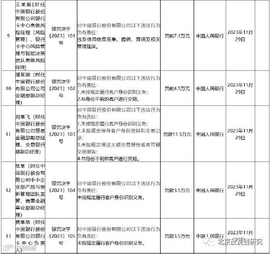 有7人被罚款1万元及以上,分别为时任中国银行股份有限公司公司金融部副总经理潘某源,时任中国银行股份有限公司中小企业部产品与创新管理团队主管、普惠金融事业部副总经理张某,时任中国银行股份有限公司银行卡中心负责人黄某岳,时任中国银行股份有限公司内控与法律合规部副总经理段某茜,时任中国银行股份有限公司金融机构部资深客户经理邢某,时任中国银行股份有限公司渠道与运营管理部副总经理韩某娟,时任中国银行股份有限公司个人金融部首席产品经理兼合规官、消费金融部首席产品经理刘某光。