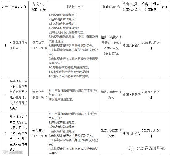12月1日,中国人民银行公布的行政处罚决定书显示,中国银行因12项违法行为被处以警告,并没收违法所得37.340315万元,罚款3664.2万元。做出行政处罚的决定日期为11月29日。