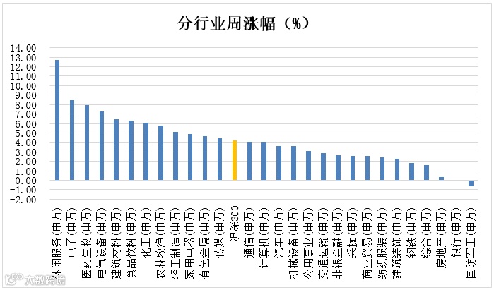 各行业来看,除国防军工下跌0.64%、银行持平之外,其他行业均呈现上涨,休闲服务、电子、医药生物涨幅前三,分别为12.71%、8.43%、7.96%;房地产、综合、钢铁涨幅较小,分别为0.35%、1.59%、1.83%。