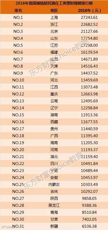 报告指出,一向精明能干的上海居民凭借人均一年27243元的潜在工资理财规模位居“2016年各省潜在工资理财排行榜”榜首,浙江、北京紧随其后。在东西部地域差异方面,东部沿海城市依旧占据潜在工资理财排行榜前列。随着中部崛起与西部大开发政策的不断施行,中西部居民的经济状况有了极大改善,主动理财意识不断增强。重庆、西藏、宁夏等中西部城市则以极快的增长速度迎头赶上,体现了东西部地区差异的缩小以及中西部居民理财意识的提高。