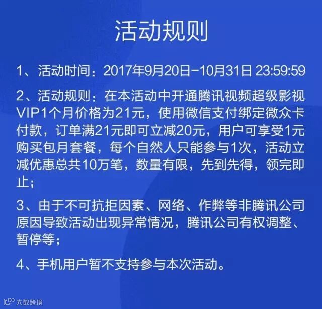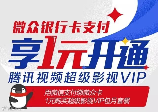 即日起至10月30日,用微众卡支付专享,1元就能开通一个月腾讯视频超级影视VIP。