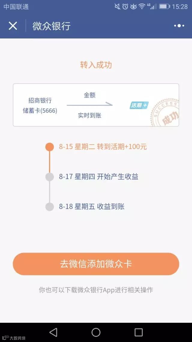 第二步:成功转入活期+后,点击底部按钮“去微信添加微众卡”,及“复制卡号”。