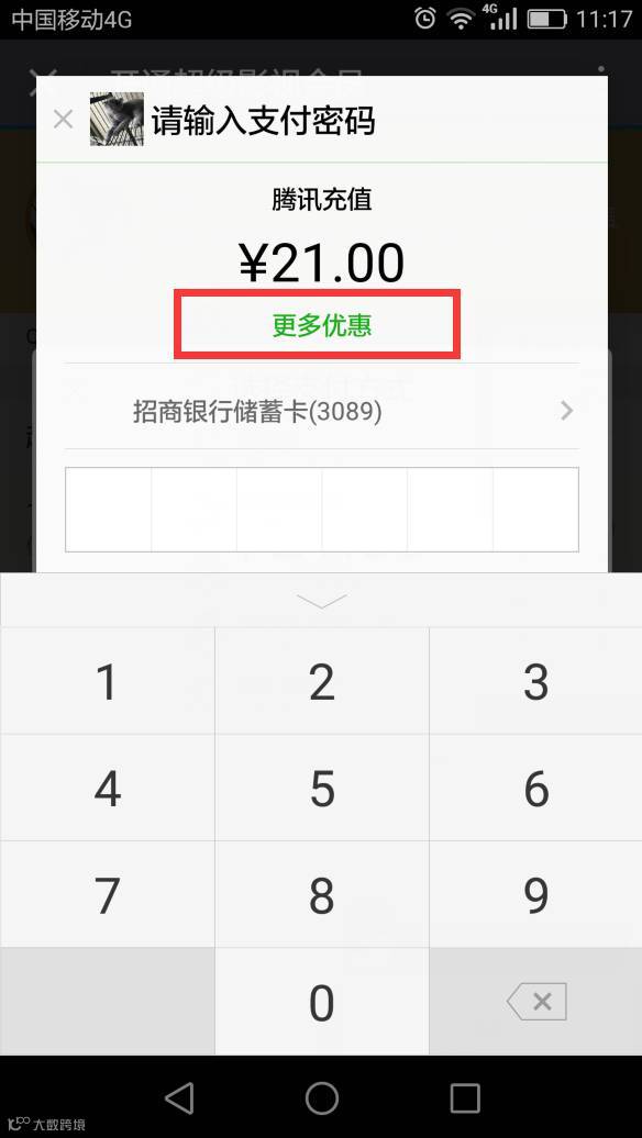 第四步:确认微信中绑定微众卡后,参与活动并用微信支付时会看到“更多优惠”字样,选择微众卡付款后就能1元带走VIP。