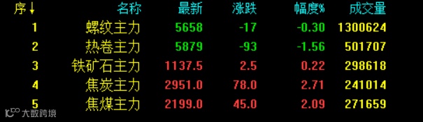 昨日黑色系涨跌互现,期螺高位调整,夜盘继续飘绿,来到日盘震荡反弹盘中翻红最终收跌,热卷与螺纹走势大致相同,原料则全线翻红,焦炭继续强势引领黑色上涨,涨近3%,焦煤来到日盘也持续冲高,铁矿石夜盘开盘1108低开后反弹,来到日盘延续反弹。截至收盘,期螺报5658(-17,-0.3%),期卷报5879(-93,-1.56%),铁矿石报1137.5(+2.5,+0.22%),焦炭报2951(+78,+2.71%),焦煤报2199(+45,+2.09%)。