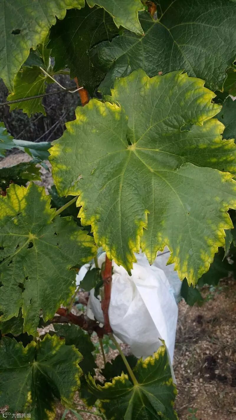 (钾过量的果穗梗,同时钾过剩会使叶片从边缘开始发黄,逐渐向里发展)