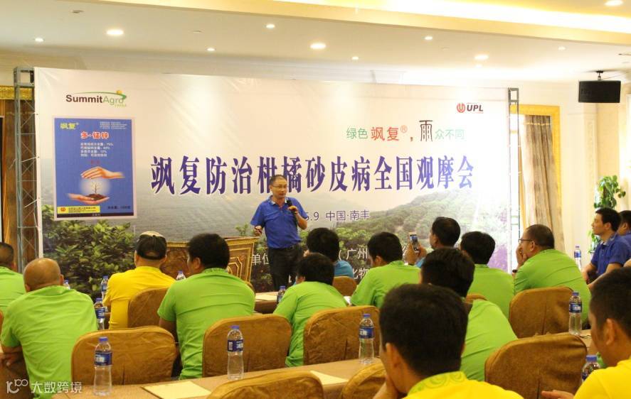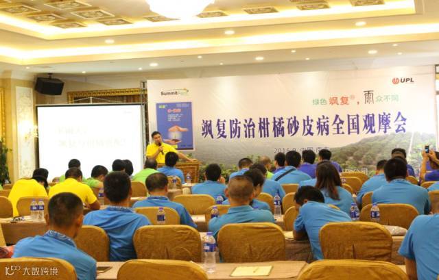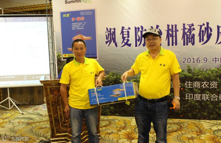 住商农资飒复产品技术主管徐锰铃先生介绍飒复产品特点和使用技术。徐主管介绍飒复优于其他产品在于两个方面:一个是色,一个是配。飒复的专利助剂,使得飒复的绿色粘附在柑橘叶片上长达1个月之久,即使连绵雨季也不影响。飒复是多菌灵(12%):代森锰锌(63%)=1:5.25配比复配而成,对多种真菌的共毒系数达150。所以飒复防治效果更加显著。