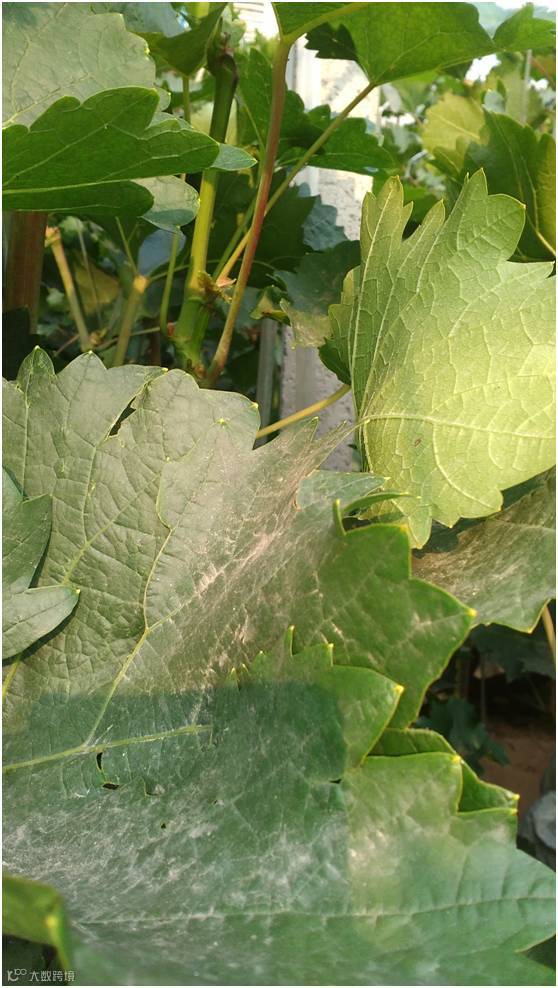 发病葡萄的叶片边缘叶尖发黄褪绿,老叶片背面的叶脉上或叶脉两侧有乳白色粒状分泌物,可以用手轻易剥落。乳白色粒状物经过一天的太阳直晒,就会变成褐色或黑色。