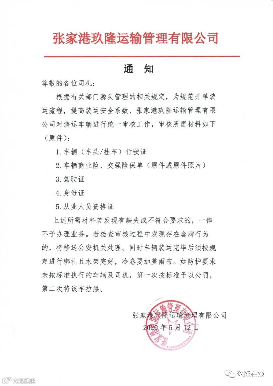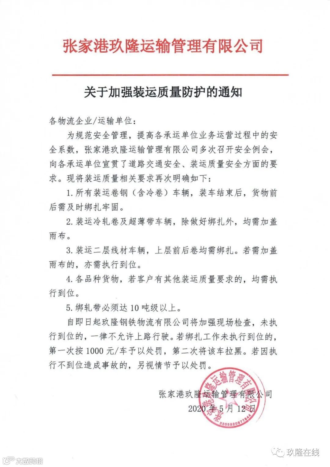 关于张家港玖隆运输管理公司装运防护的通知