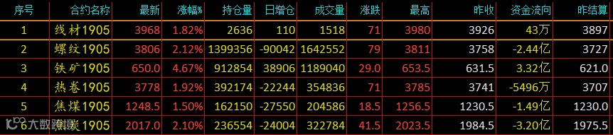受利好消息影响,今日黑色板块普涨,螺纹涨2.12%至3806,热卷涨1.92%至3778,焦煤涨1.5%至1248.5,焦炭涨2.1%至2017,线材涨1.82%至3968,铁矿石大涨4.67%至650。利好消息刺激期钢相关品种走强。