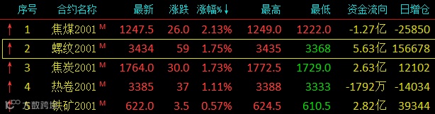今日黑色系久违全线飘红!其中,焦煤大涨2.13%,焦炭涨1.73%;螺纹钢主力合约2001强势冲高,截至收市报3434(+1.75%,+59),是10月以来的最大单日涨幅。另外,期卷主力涨1.11%。
