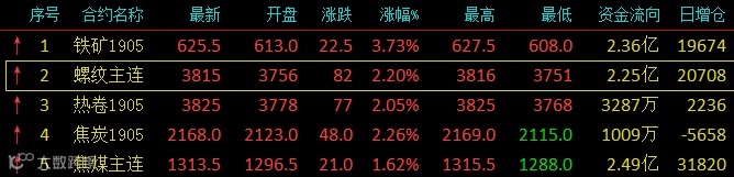 钢厂一片涨声,加上唐山钢坯涨至3490元/吨,助推黑色系期货集体走强,特别是午后涨势凶猛。今日铁矿石大涨3.73%,螺纹钢、热卷、焦炭均涨逾2%。截至收市,螺纹钢主力1905冲上3800,报3815(+82,2.20%)。