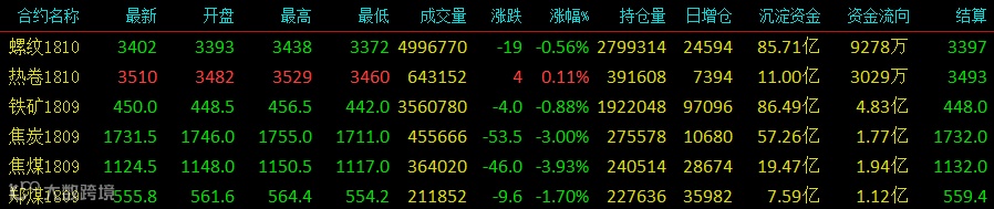 今日黑色系盘中继续上演多空拉锯,做多做空都有理由,多头认为:库存在下降,需求在回升,还有环保检查影响供给,钢价还会延续当前反弹趋势;空头认为:库存仍处于高位,钢厂利润可观,资金面紧张导致需求不及预期,钢价还会继续下探;在市场分歧较大的情况下,任何外围的风吹草动都会引发盘面的波动;加上近来国内外又是波澜不止,贸易战,地缘危机,国内大小会议一个接一个,政策解读也是五花八门,就连天气情况也得预测,做个期货真不容易;抛开繁杂的基本面来看技术面:螺纹热卷价格勉强站上20日均线;铁矿再低位震荡横盘调整;双焦偏弱下行,向下考验前期低点支撑;黑色各品种均已完成主力合约换月,目前处于仓量上升阶段,多空都在布局,价格也处于拉锯阶段;目前来看多空都有机会,踩准市场节奏,区间操作可能是近期比较好的策略;收盘螺纹主力收3402跌19;热卷主力收3510涨4;铁矿石主力收450跌4;焦炭主力收1731.5跌53.5;焦煤主力收1124.5跌46;郑煤主力收555.8跌9.6。