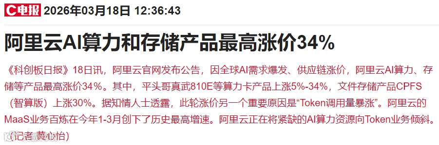 关于算力,今天又有一条新的催化,阿里云AI算力和存储产品最高涨价34%。