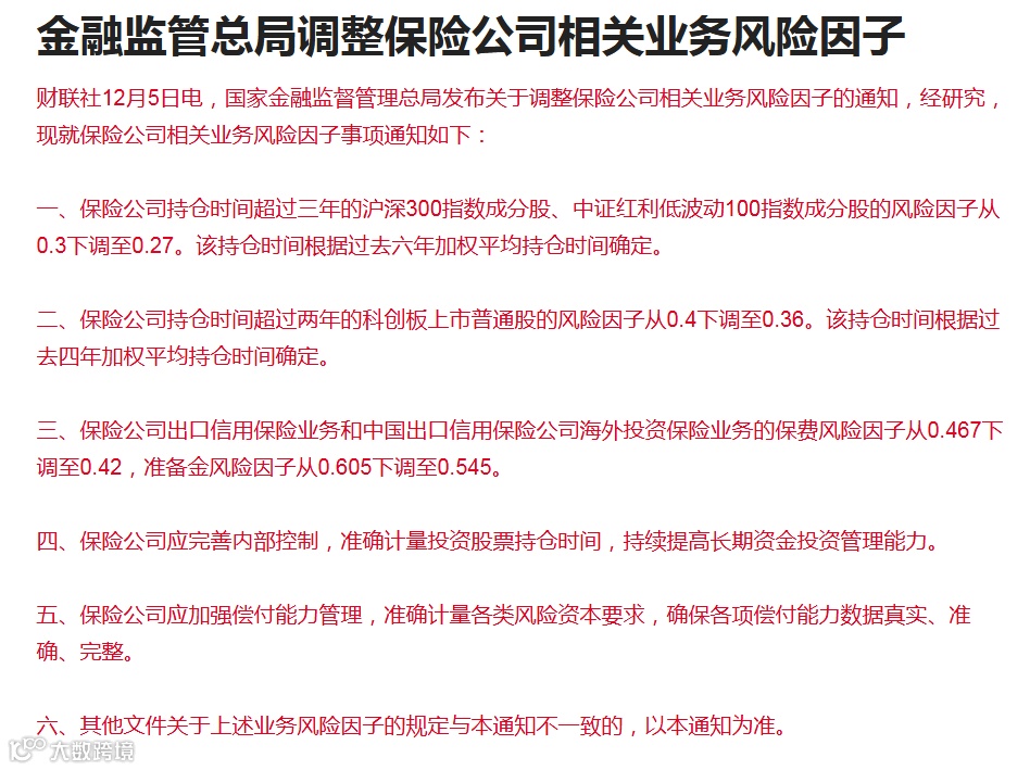 今天收盘后,金融监管总结下发了一个通知,调整保险公司投资相关股票的风险因子。具体细节参照下图: