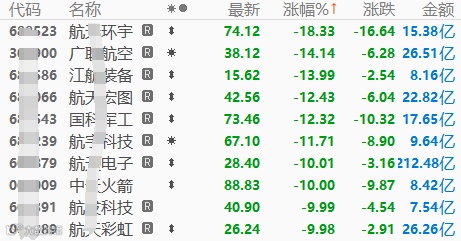 两市下跌个股数量也来到了3700家,科技成长赛道普遍下跌。这其中,此前大热的商业航天板块,出现了罕见的跌停潮。