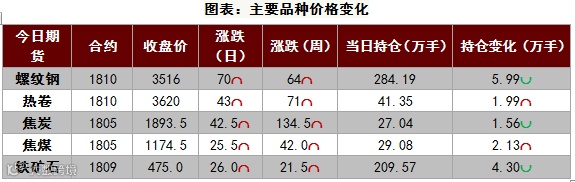 今日国内黑色系商品期货全线上涨,其中铁矿大幅补涨,接近涨停;热卷较弱,小幅上涨;其余品种均收涨2%以上,成交大幅放量。具体来看,受外围市场大宗商品暴涨影响,夜盘市场铁矿期货高开高走,迅速上涨,带动黑色系整体上行,但本周双焦已经大幅拉升,导致盘中部分获利盘出局,一度收绿,但随着我的钢铁网库存的出炉,螺纹钢降库速度保持高位,对市场有所提振,午后成品材迎来一波小幅上涨,黑色系总体共振上行。总体来看,弱势品种铁矿迎来补涨,短期谨防市场深度洗盘,操作上面建议,逢低做多,获利及时减仓,滚动操作,注意仓位。