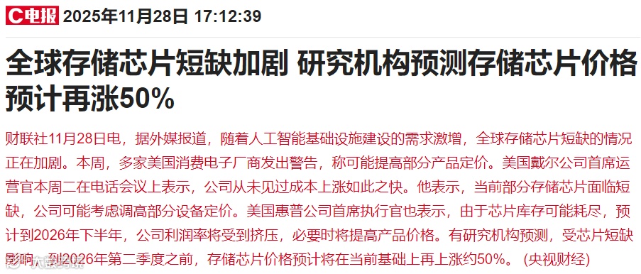 ①受芯片短缺影响,到2026年第二季度之前,存储芯片价格预计将在当前基础上再上涨约50%;
