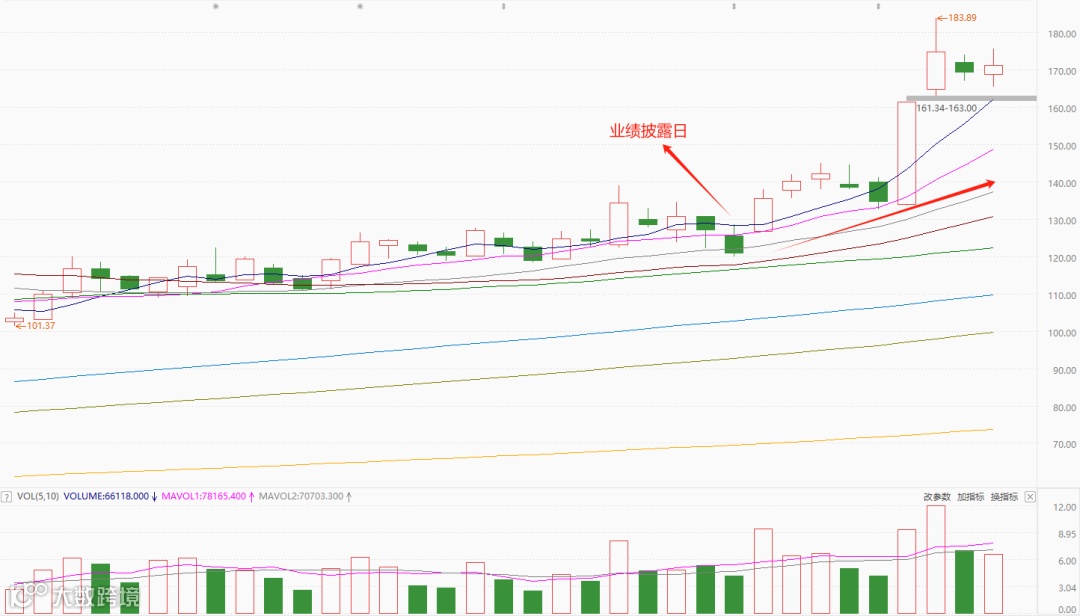 业绩发布之后,股价出现跳空放量大涨,且缺口不被回补。比如: