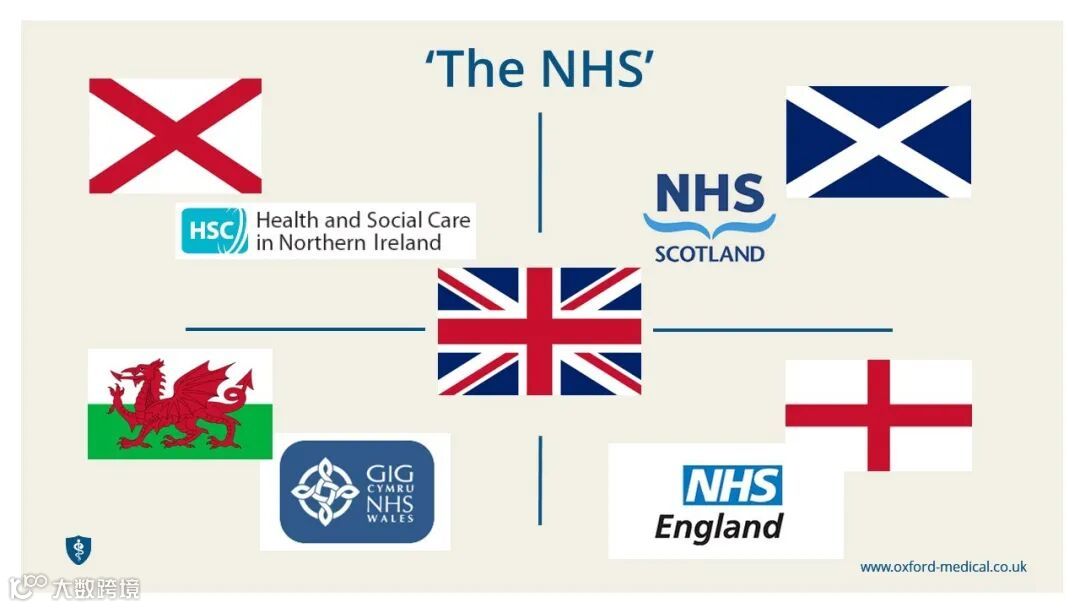 NHS作为全国性医疗体系运作,但同时也属于英国权力下放制度的一部分。因此,英格兰、苏格兰、威尔士和北爱尔兰各自地区的NHS由各自地区议会管理,并制定独立的医疗政策。