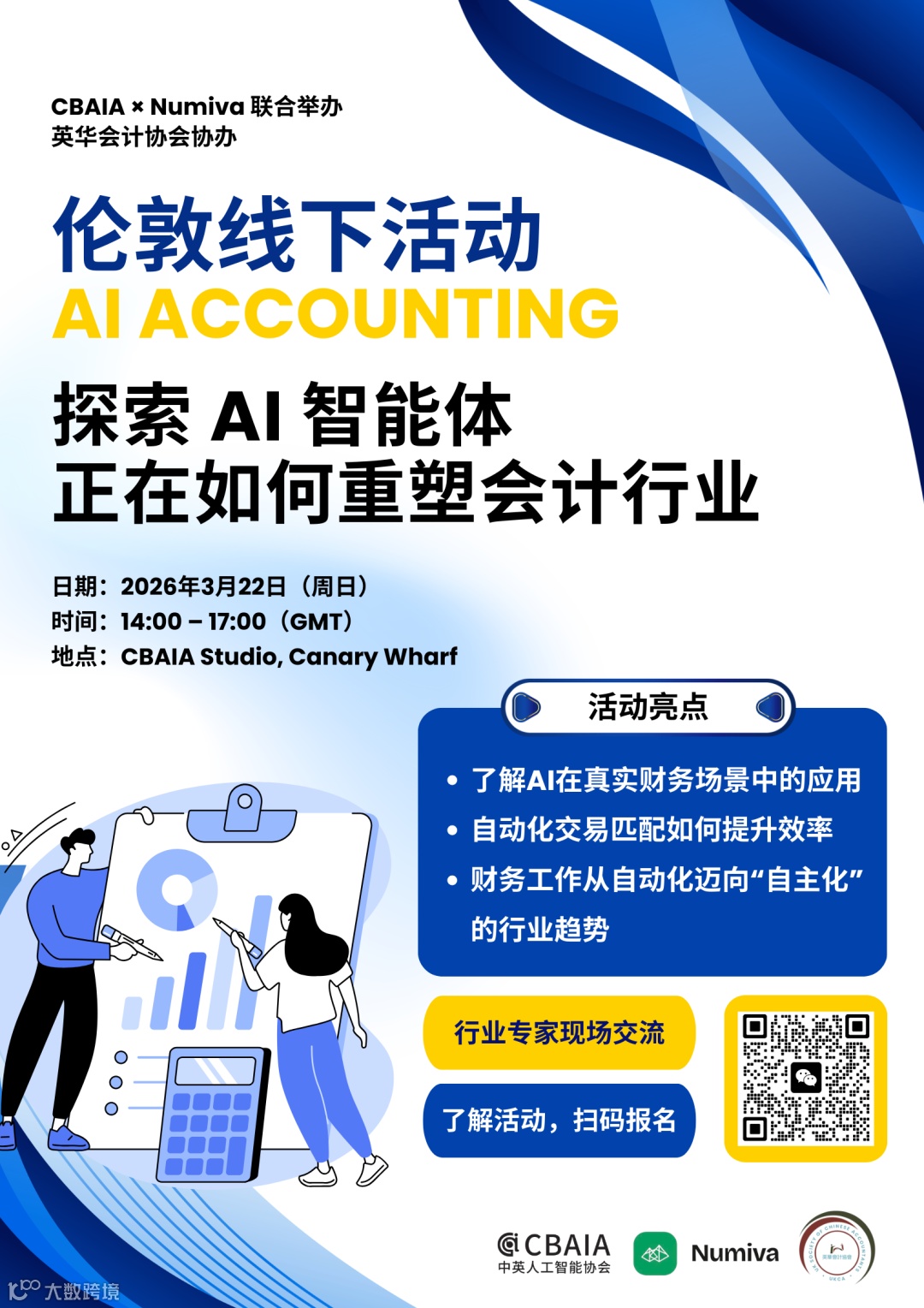 本次线下活动【AI Accounting】由中英人工智能协会CBAIA × Numiva 联合举办,英华会计协会协办。带您一起探索AI如何重塑会计与金融行业的未来。