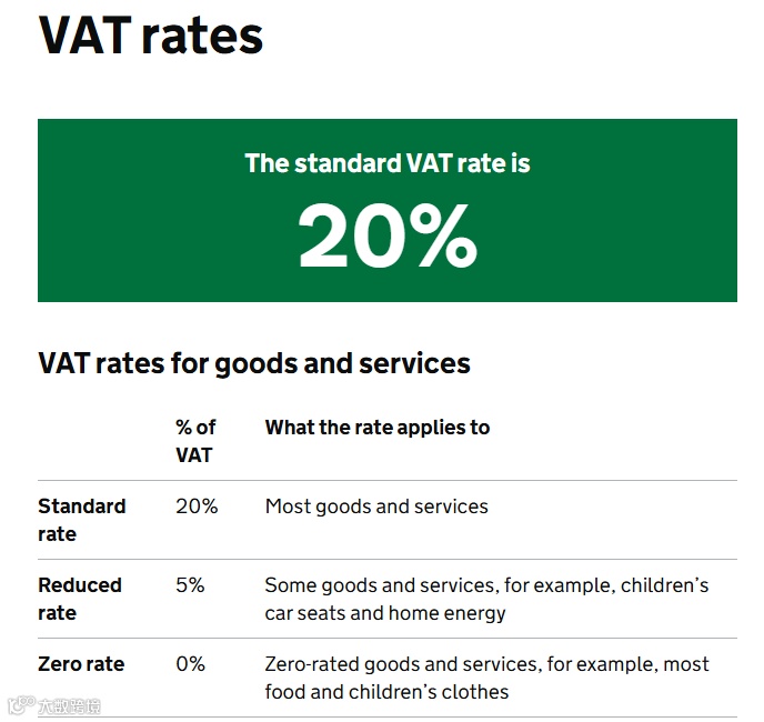 增值税是对销售商品或服务的征税。如果公司年销售额超过90,000英镑,则必须注册增值税(VAT)。对于销售额低于90,000英镑的公司,则可以选择不注册增值税,或者选择自愿注册增值税。标准VAT税率为20%。一些特定商品和服务可能适用5%或0%增值税,如某些食品、儿童服装、书籍等。