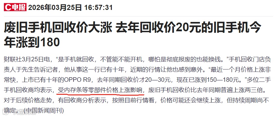 存储方面,景气度依旧持续向好。就连旧手机价格,也随着内存条水涨船高。今晚就去把旧手机找出来,卖一卖!