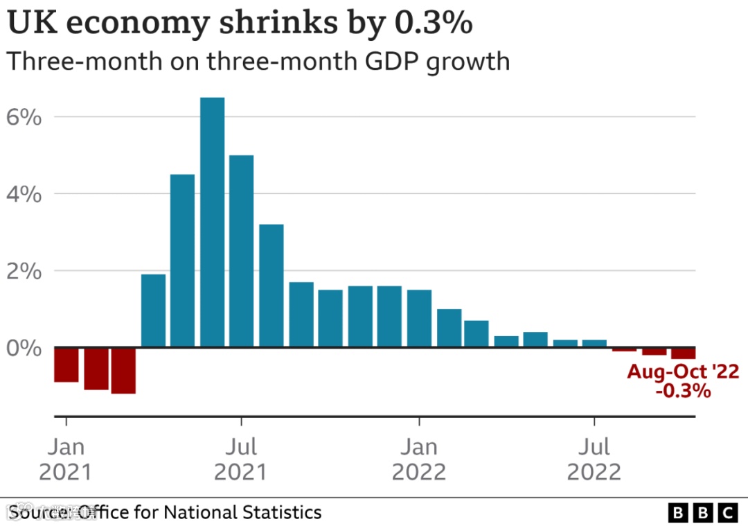 由于能源价格以及生活成本的飙升打击企业和家庭,经济在三个月内收缩了0.3%,预计英国将陷入衰退。预计明年年初公布2022年10月到12月经济数据时,将会正式确认该消息。