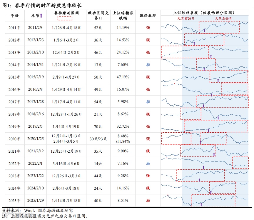 首先是大势,整体保持乐观。以史为鉴,在2011年至2025年期间,春季行情的平均持续时间约为38.57个交易日,沪指平均涨幅为15.35%。
