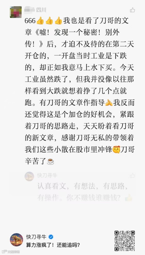 这里,要特别表扬下面这位刀粉。从留言可以看出,他她很用心在做投资,对自己的钱负责。依我看,这样的人,迟早赚大钱!