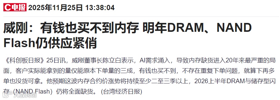 就在今天,更有行业大佬直言:有钱也买不到内存,明年DRAM、NAND Flash仍供应紧俏。