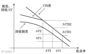 当市场收益率距离期货票面利率较远的时候,CTD券一般不容易发生改变,转换期权的价值较低,此时DV01(F)=DV01(CTD)/CF(CTD)的关系式“基本上”正确。当市场收益率距离期货票面利率较近的时候,CTD券有可能会发生改变,转换期权具有较高的价值,此时期货价格的基点价值会同时受到CTD券的基点价值和转换期权的影响,因此DV01(F)=DV01(CTD)/CF(CTD)的关系式就变得不正确了。ΔF与ΔCTD之间的关系如图4所示: