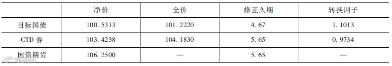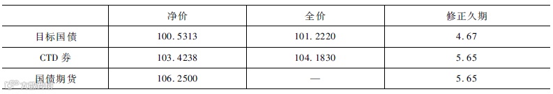 假设目标国债、CTD券和期货的价格与修正久期如表2所示: