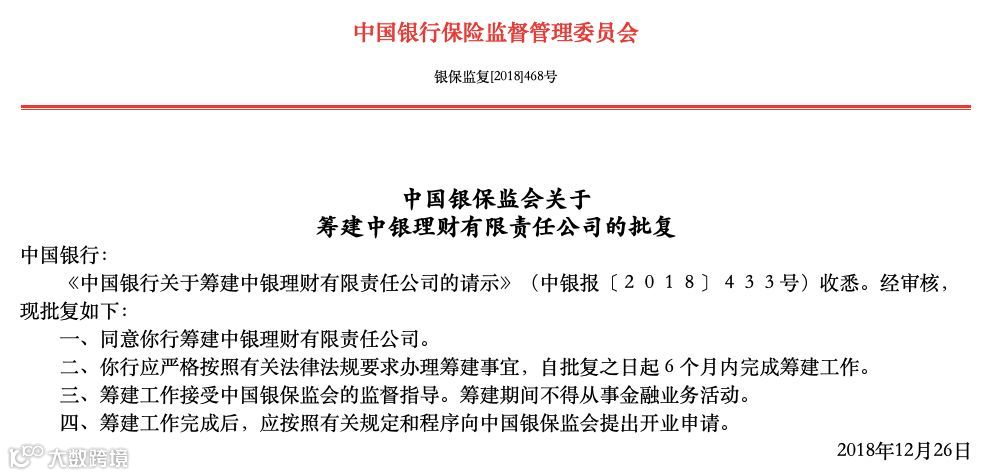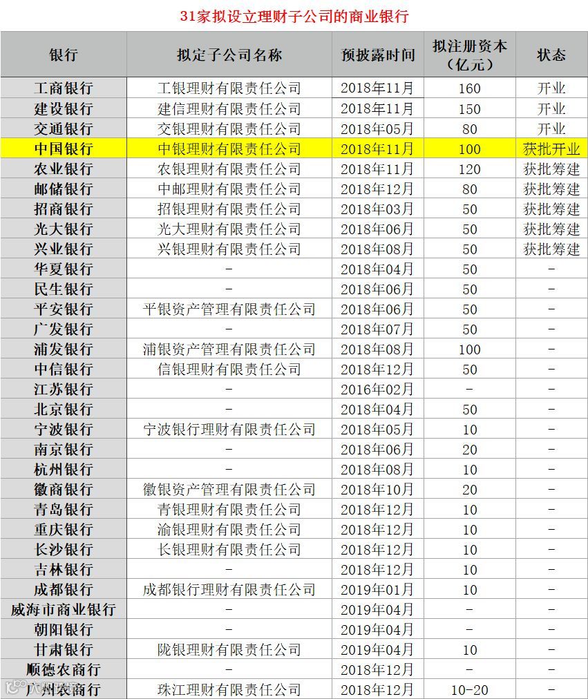 2018年11月15日,中行发布了公告对外投资设立全资子公司中银理财;一个多月后的12月26日,中银理财与建信理财一起获得银保监会批复筹建,为全国首批;半年后的今天,中银理财获批开业,即将成为第四家开业的银行理财子公司。