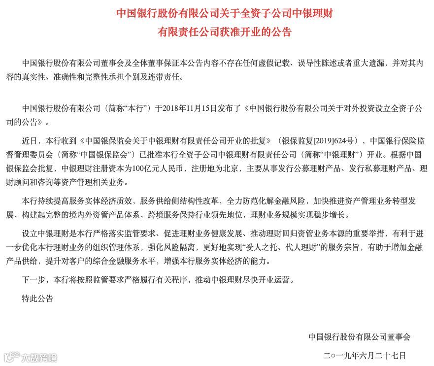 6月27日中国银行公告称,其全资子公司中银理财有限责任公司获准开业,注册资本100亿元。