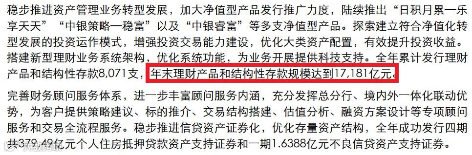 中国银行2018年年报显示:年末理财产品和结构性存款规模达到17181亿元。