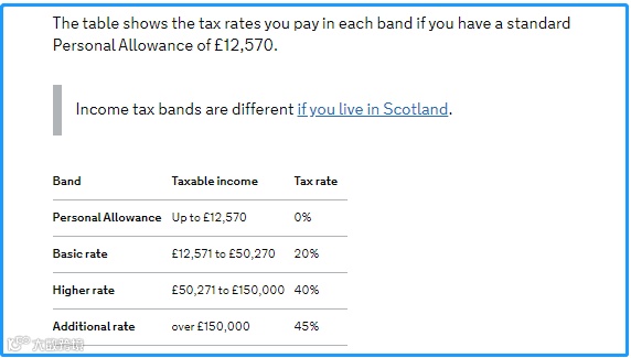 下表为英国个人所得税的档次,其中当前税务年度(2021年4月6日到2022年4月5日)的年度个人免税额为£ 12,570 。