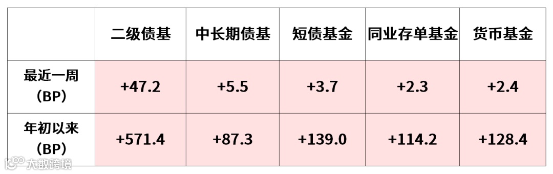 注:数据来源于Wind,口径截至2025.12.28。其中二级债基、中长期债基、短债基金、同业存单基金、货币基金分别对应万得混合债券型二级基金指数(885007.WI)、万得中长期纯债型基金指数(885008.WI)、万得短期纯债型基金指数(885062.WI)、万得同业存单基金指数(885045.WI)、万得货币市场基金指数(885009.WI)。债券利率上行,对应着债券价格下跌,意味着固收类产品的净值趋于震荡或下滑,投资收益下降。反之,债券利率下行,对应着债券价格上涨,意味着固收类产品净值上行,投资收益上升。基金净值上涨1BP=上涨0.01%。