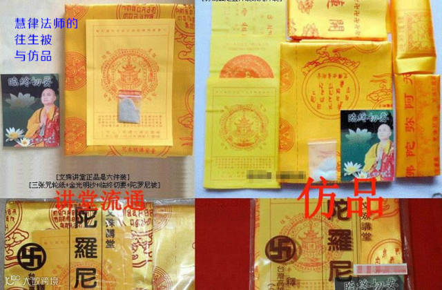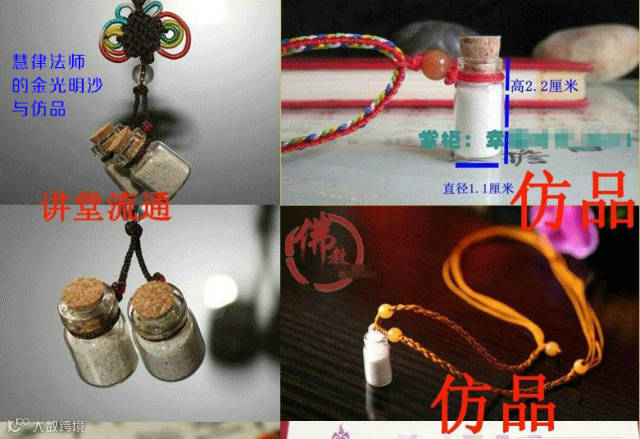 (注:金光明沙系根据密部,持毗卢遮那佛大灌顶光真言所加持之土沙。目的在于透过咒力、愿力及心力三者相结合,转变被加持者之心念,助其安度生死大关。对已亡故二、三十年者,金光明沙仍有超度效力。慧 律法师加持过的金光明沙、咒轮、往生被,流通甚广,影响巨大,但除了香港慧律法师佛经流通处之外,慧律法师主持的文殊讲堂并未在大陆任何地区或网站流通其 加持品,敬请广大佛友注意!故若有缘请到慧律法师加持过的法宝固然好,若无缘请到,勿购买各种仿品滥竽充数,而是一心助念佛号,不强攀外缘,反而为佳)