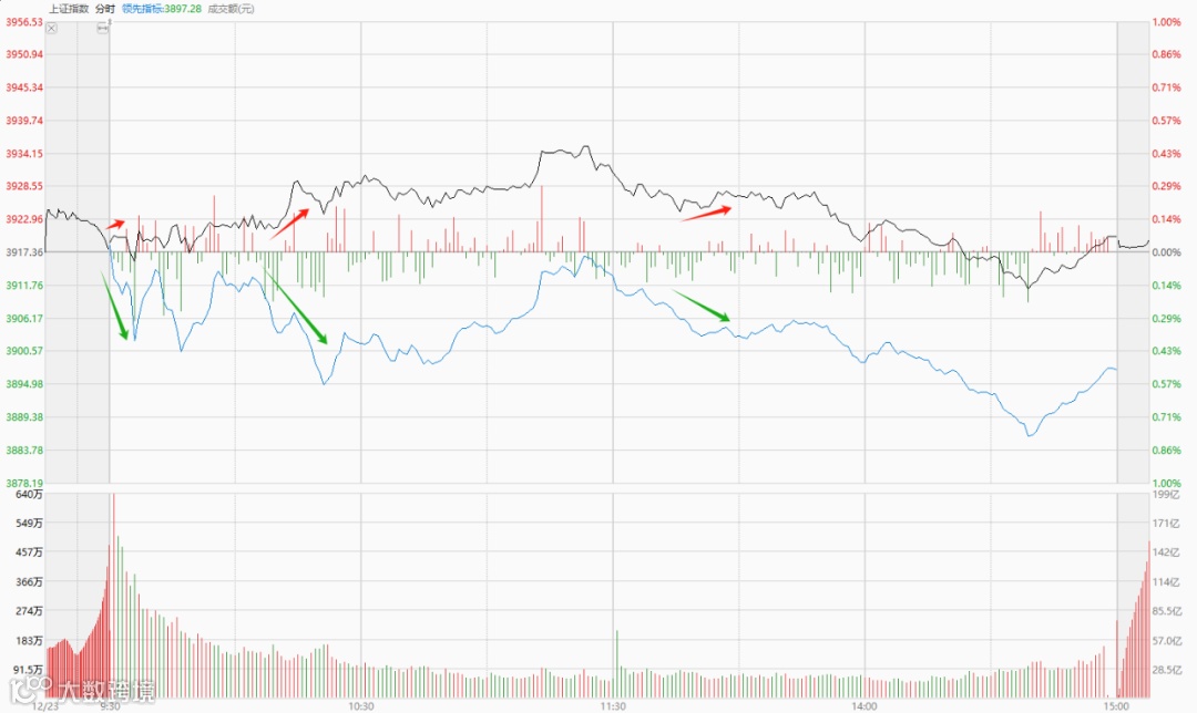 如上图箭头处,沪指分时图出现了三次“黑色曲线向上,蓝色曲线向下”的情形,类似于一种“鳄鱼嘴”形态。